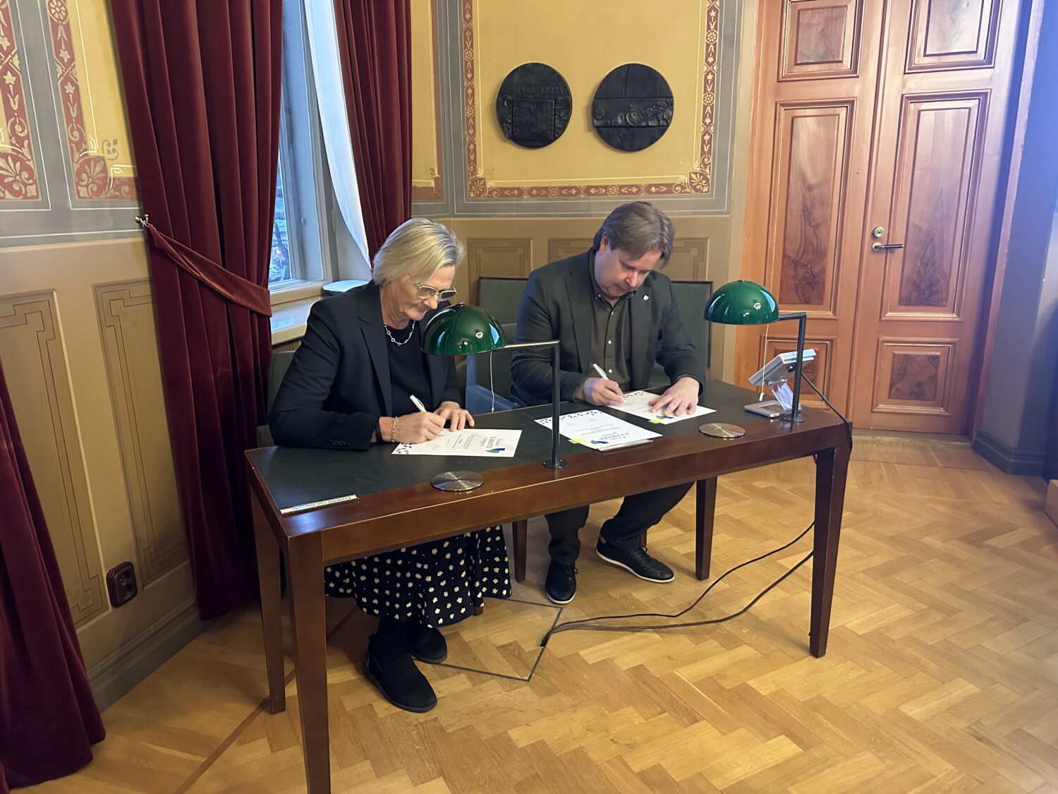 Borgå stads stadsdirektör Jani Pitkäniemi och Prakticums rektor Laila Andersson undertecknade avtalet den 20 november 2025 vid en ceremoni i stadshuset. Som klimatpartner får Prakticum möjlighet att delta i stadens nätverk för hållbar utveckling, ta del av gemensamma evenemang och utbyta erfarenheter med andra organisationer som arbetar för en grönare framtid.